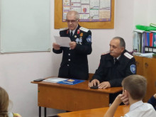 Старейшины ХКО Соколовское - вахмистр Селезнёв В.А и подъесаул Кравченко В.П. - провели беседу в МБОУ СОШ № 14. Казаки и казачата -пятиклассники беседовали на тему патриотизма и службы Отечеству.